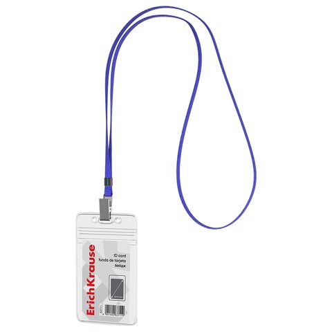 Бейдж вертикальный в комплекте с лентой. Материал бейджа – ПВХ, цвет – прозрачный. Размер вставки составляет 62х91 мм. Лента синего цвета, изготовлена из полиэстера, имеет металлический зажим. Ширина ленты составляет 12 мм. Длина ленты – 420 мм. Бейдж подходит для ношения именных карточек и пропусков.