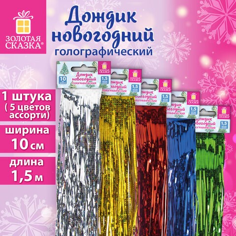 Высота дождика в расправленном и подвешенном виде составляет 1,5 м, ширина – 10 см. Материал дождика – полиэтилентерефталат. Эффект голографии завораживает взгляд и создает атмосферу зимней сказки.