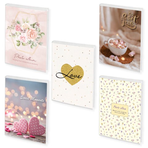 Обложка фотоальбома представлена в 5 дизайнах. Листы склеены в единый блок. Размер альбома – 12х16 см.