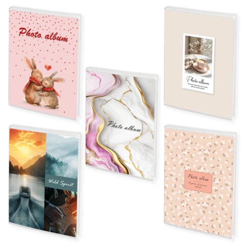 Обложка фотоальбома представлена в 5 дизайнах. Листы склеены в единый блок. Размер альбома – 12х16 см.