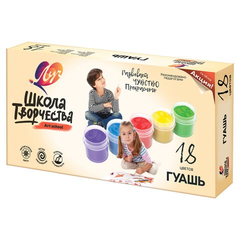 Гуашь серии "Школа творчества" изготовлена по улучшенной рецептуре. Благодаря этому цвета краски, не теряя своей яркости и красоты, стали максимально подготовлены для быстрого рисования. Гуашь имеет отличную укрывистость, легко смывается с рук и одежды.