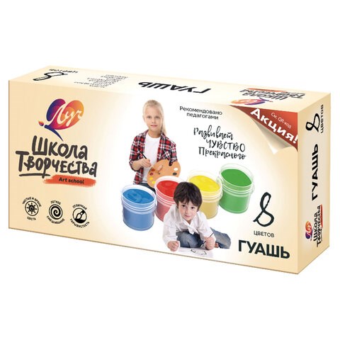 Гуашь серии "Школа творчества" изготовлена по улучшенной рецептуре. Благодаря этому цвета краски, не теряя своей яркости и красоты, стали максимально подготовлены для быстрого рисования. Гуашь имеет отличную укрывистость, легко смывается с рук и одежды.