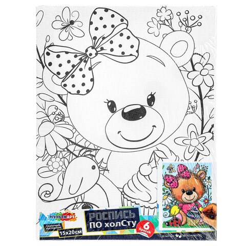 В набор входит: 1 хлопковый холст с контуром, 6 акриловых красок, 1 синтетическая кисть.