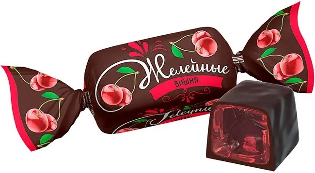 Конфеты с натуральным соком, в темной глазури. – С соком садовой вишни. – Глазурь из отборных какао-бобов.