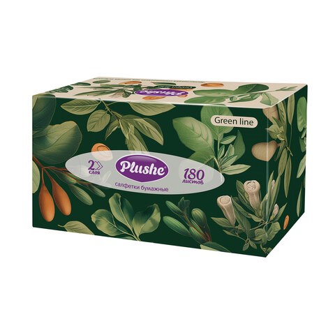 Салфетки PLUSHE "Green Line" формата нон-стоп непрерывно достаются одна за одной. Коробочки универсальны и подойдут для использования, как дома, так и на природе.