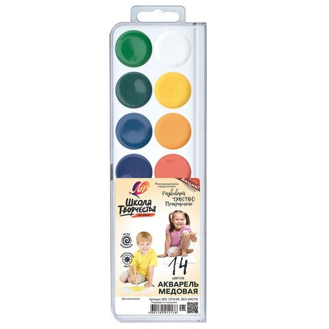Краски акварельные изготовлены на основе органических пигментов и натурального связующего с добавлением пчелиного мёда. Предназначены для детского творчества и различных живописных работ. Отличаются хорошей прозрачностью, яркостью и чистотой цвета.