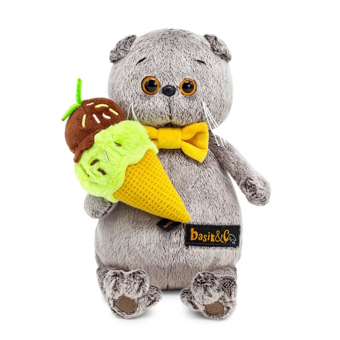 Мягкая игрушка «Кот Басик с мороженым» — обаятельный котик, который словно сошёл с летней открытки. Он держит в лапке мягкое мороженое, а яркий жёлтый бантик добавляет образу солнечного настроения. Басик подарит тепло, уют и станет любимым другом ребёнка или стильным украшением комнаты.