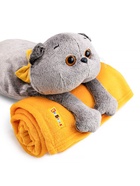 - Игрушка выполнена в виде очаровательного серого котика, который поставляется с мягким пледом, добавляя функциональности и практичности.