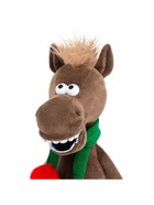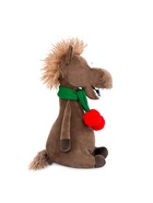 - Игрушка выполнена в виде доброго жеребца с мягкой текстурой искусственного меха и яркими акцентами: вокруг шеи обмотан шарф с красными мягкими бубенцами, которые добавляют игривости.