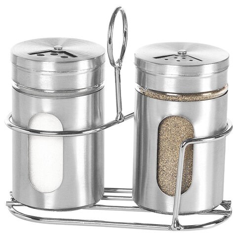 Набор для специй WEGLA представляет собой набор из двух солонок-перечниц, предназначенный для удобного хранения и дозированной подачи сыпучих продуктов, таких как соль, перец или иные специи, а также для сервировки стола. В комплект входит устойчивая металлическая подставка, которая гарантирует порядок и компактное размещение набора для специй на поверхности. Размер одной солонки составляет 8,2х5x5 см.