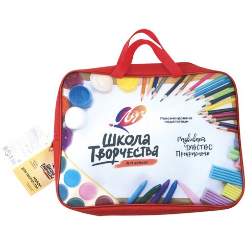 Подарочный набор для творчества ЛУЧ "Школа творчества" состоит из различных канцелярских товаров, которые упакованы в удобную для переноски красочную папку на молнии с двумя ручками. Все они включены в обязательный список покупок к школе.