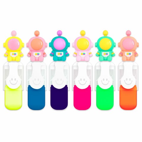 Текстовыделители имеют плоскую форму корпуса с диаметром 23 мм. Колпак украшен ярким топпером в форме космонавта. Скошенный наконечник с толщиной линии письма от 1 до 4 мм обеспечивает удобство при работе с текстом, напечатанным мелким шрифтом, или таблицами. В комплект входит прозрачная сумочка для хранения длиной 15,5 см.