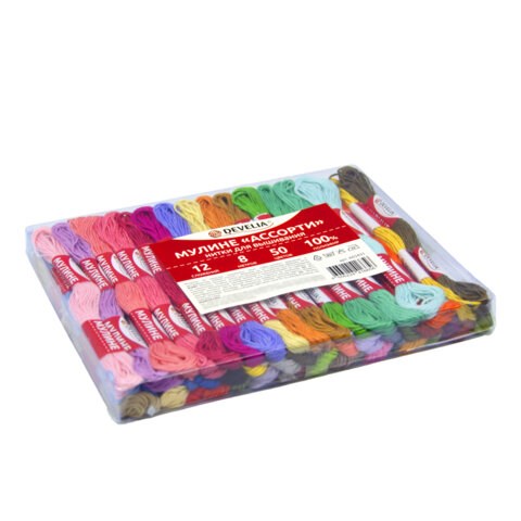 Набор ниток мулине DEVELIA состоит из 50 мотков ниток ярких цветов в 12 сложений в намотке по 8 метров. Поставляются в пластиковом прозрачном боксе с удобной крышкой.