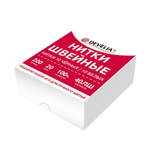 В набор входит 20 катушек 40 ЛШ двух цветов (белый, черный) в намотке 200 м и набор игл для ручного шитья (15 штук). Поставляются в картонной коробке.