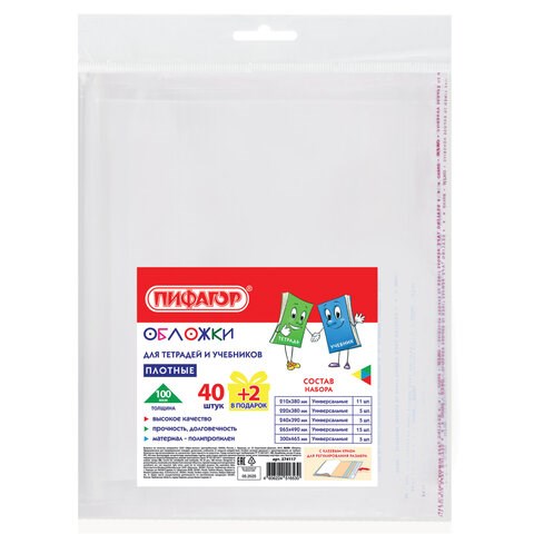 Прозрачные плотные обложки ПИФАГОР для тетрадей и учебников изготовлены из полипропилена (ПП) толщиной 100 мкм. Благодаря КЛЕЙКОМУ КРАЮ обложка легко регулируется по ширине.