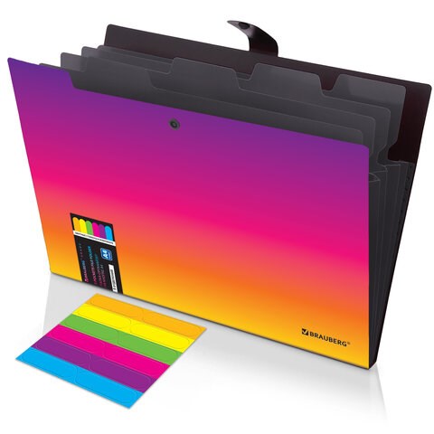Папка-органайзер изготовлена из качественного пластика толщиной 0,5 мм с ярким градиентным дизайном и с фактурой "песок", снабжена разделителями черного цвета.