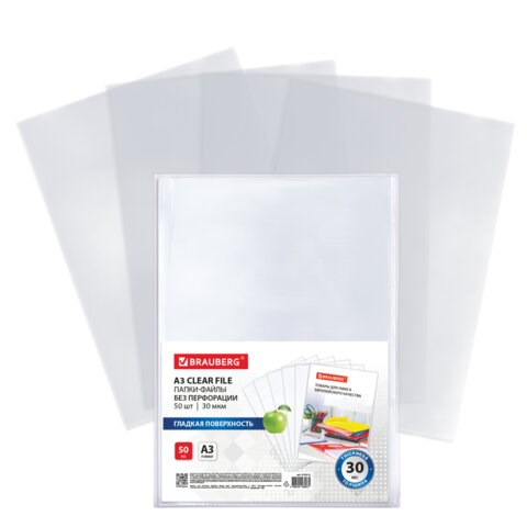 Папки-файлы БЕЗ ПЕРФОРАЦИИ, БОЛЬШОГО ФОРМАТА А3 для хранения и защиты документов, BRAUBERG, КОМПЛЕКТ 50 шт., гладкие, 30 мкм, 273012