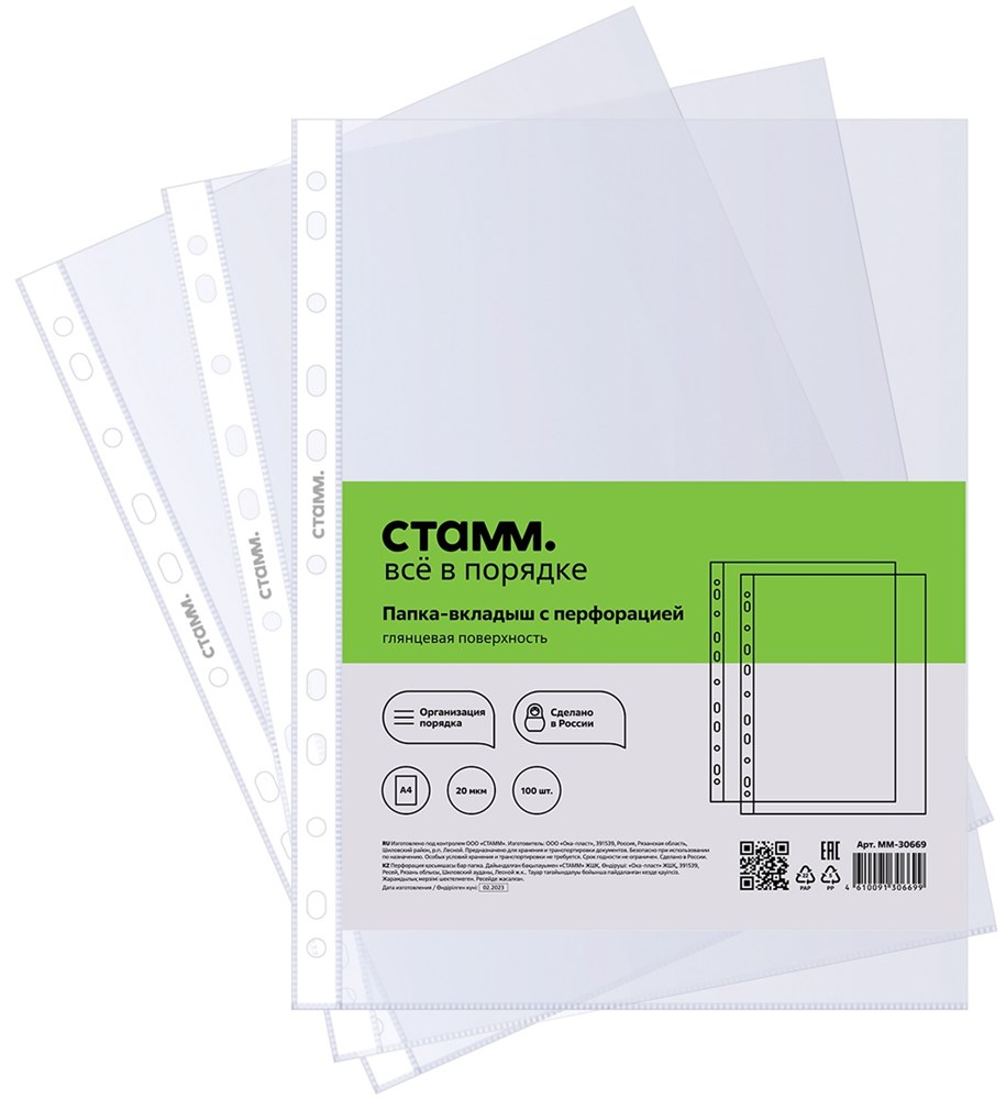 Папка-вкладыш с перфорацией «СТАММ» отлично подойдет для хранения и систематизации документов. Папка размером 305*235 мм изготовлена из полипропилена толщиной 20 мкм. Папка вмещает до 50 листов. Имеет глянцевую текстуру, защищает листы от внешних воздействий. Перфорация на боковой части позволяет разместить изделие в папке с любым кольцевым механизмом или скоросшивателем. Упакованы в пакет по 100 штук.