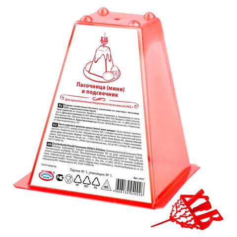 Пасочница пасхальная объёмом 465гр (размеры 11х8,5х8,5 см) выполнена из пластика ярко-красного цвета.