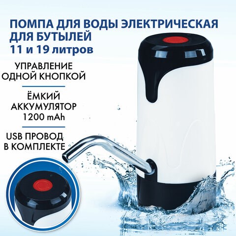 Производительность этой модели помпы составляет 1,2 л/мин. Встроенный аккумулятор 1200 mAч, которого хватает, в среднем, на 4-6 бутылей. В комплект входят USB-кабель, адаптер 220V и силиконовая трубка. Высота помпы для воды составляет 15,5 см.