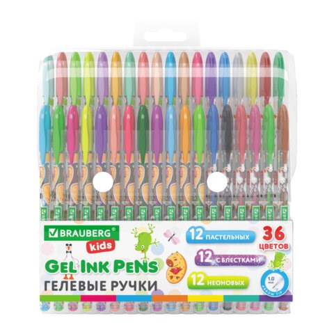 Набор включает 36 ручек с различными эффектами и цветами чернил: 12 ручек с пастельными оттенками, 12 ручек с блестками, 12 ручек с неоновыми оттенками. Разнообразная палитра побуждает к экспериментам и позволяет воплотить в жизнь даже самые нестандартные задумки.