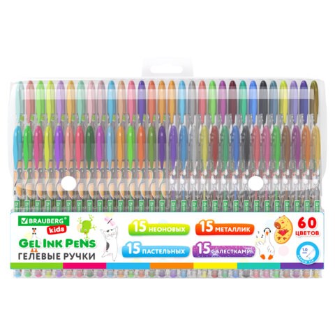 Набор включает 60 ручек с различными эффектами и цветами чернил: 15 ручек с неоновыми оттенками, 15 ручек с эффектом металлик, 15 ручек с пастельными оттенками, 15 ручек с блестками. Богатая палитра открывает безграничные возможности для творчества, позволяя для любой детали рисунка подбирать нужный оттенок и сочетать самые разные эффекты.