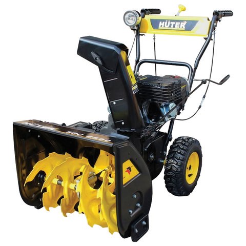 Металлический шнек может измельчать плотный или мокрый снег. Для электростартера необходим аккумулятор 12 В, 10 Ач. Рабочая система снегоуборщика Huter представляет собой снегозаборный желоб со шнеком, а также вентилятор в форме крыльчатки и желоб для выброса снега. Агрегат приводится в действие четырехтактным поршневым одноцилиндровым бензиновым двигателем внутреннего сгорания с воздушным охлаждением.