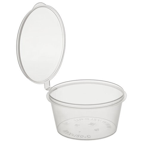 Порционный соусник прозрачный, с верхним закрытием имеет круглую форму. «Верхнее закрытие» соуса обеспечивает герметичность и сохранность продукта. Прозрачность - позволяет видеть содержимое и контролировать его количество. Соусник произведен из качественного полипропилена (PP), который прочный и устойчив к жирам и кислотам, рассчитан на высокие температуры (до +120°C). Объем (вместимость) 80мл., диаметр 62мм., высота 33мм.