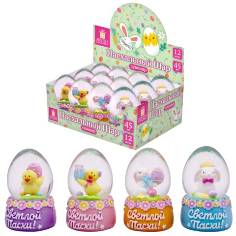 Сувенир представляет собой стеклянный шар со сказочной композицией из фигурок пасхальных персонажей внутри. На подставках, украшенных весенними цветами - пожелания к празднику! Сувенир представлен в 4 уникальных дизайнах в ассортименте — каждый из них передаёт дух светлого праздника: пасхальные яйца, цветочные мотивы, цыплята, барашки, символы возрождения и весны.