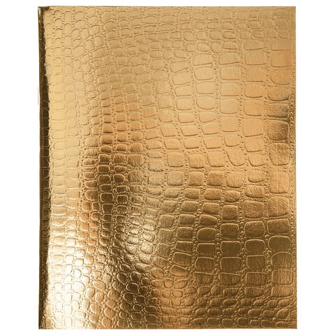 Тетрадь А5 формата, 96 листов. Материал обложки – бумвинил, "Metallic", золотой, дополненный спецэффектами в виде тиснения CROCO. Внутренний блок – офсетная бумага 60 г/м2, клетка. Тип скрепления – скоба.