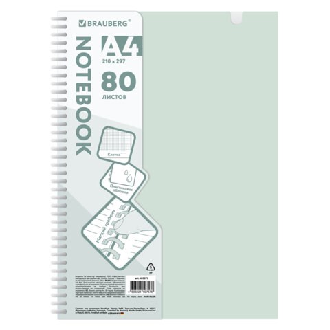 Тетрадь обложка пластик, А4 80 л., гребень мягкий, вырубка для ручки, клетка, BRAUBERG, светло-зеленый, 405373 - фото 6881592