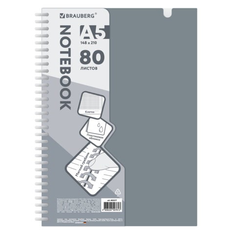 Прочная пластиковая обложка надежно защищает внутренний блок от повреждений и влаги, продлевая срок службы тетради. Обложка тетради оснащена специальной вырубкой для удобного крепления ручки. Внутри – 80 листов высококачественной офсетной бумаги плотностью 70 г/м2 и белизной 100%, обеспечивающей комфортное письмо. Удобная линовка в клетку с полями помогает вести структурированные записи. Листы скреплены мягким силиконовым гребнем, что обеспечивает удобство использования тетради и комфорт при письме. Тетрадь формата А5 – это удобное и практичное решение для учебы, работы и повседневных заметок. Она компактна, легко помещается в сумку или рюкзак, но при этом вместительна для удобного письма.