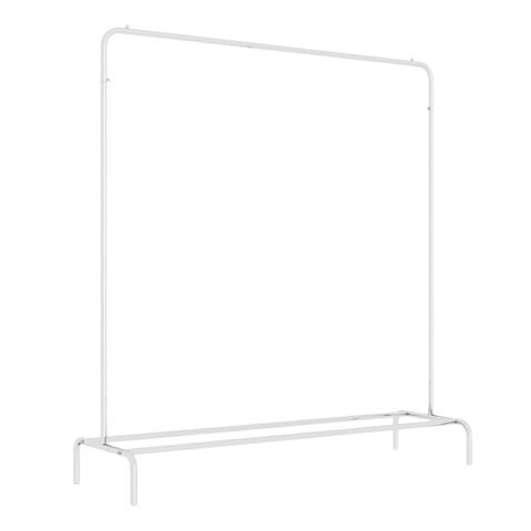 Железная перекладина вмещает до 18 плечиков, распределенная нагрузка – до 30 кг. Перекладина оснащена ограничителями, предотвращающими соскальзывание плечиков. Внизу полка для размещения обуви, коробок или органайзеров. На ножках предусмотрены заглушки, защищающие пол от повреждений. Мобильная благодаря минимальному весу.